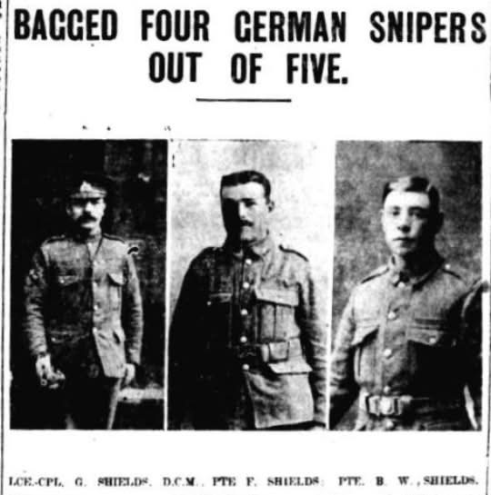 Laying the rifle down, Corpl. Shields went on his way and thought no more about it. It was a considerable surprise to find that the D.C.M had been awarded him.