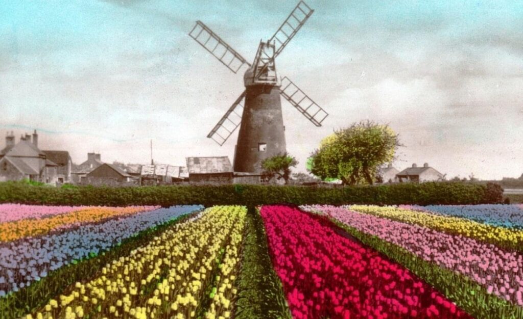 The mill with Tulip field from a postcard by Spalding Free Press Co, Ltd