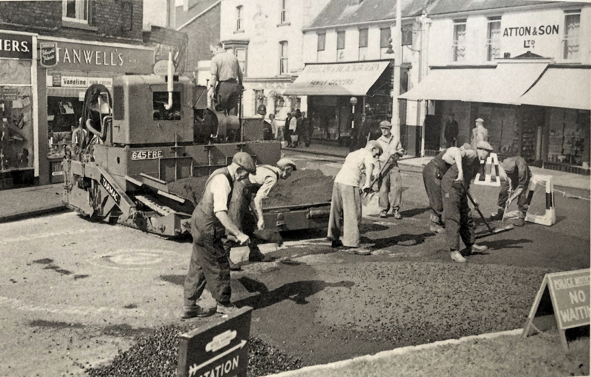 1950s and a Tarmac Machine working in Hall place to replace cobbles with Tarmac. Source Spalding in the Fifties
